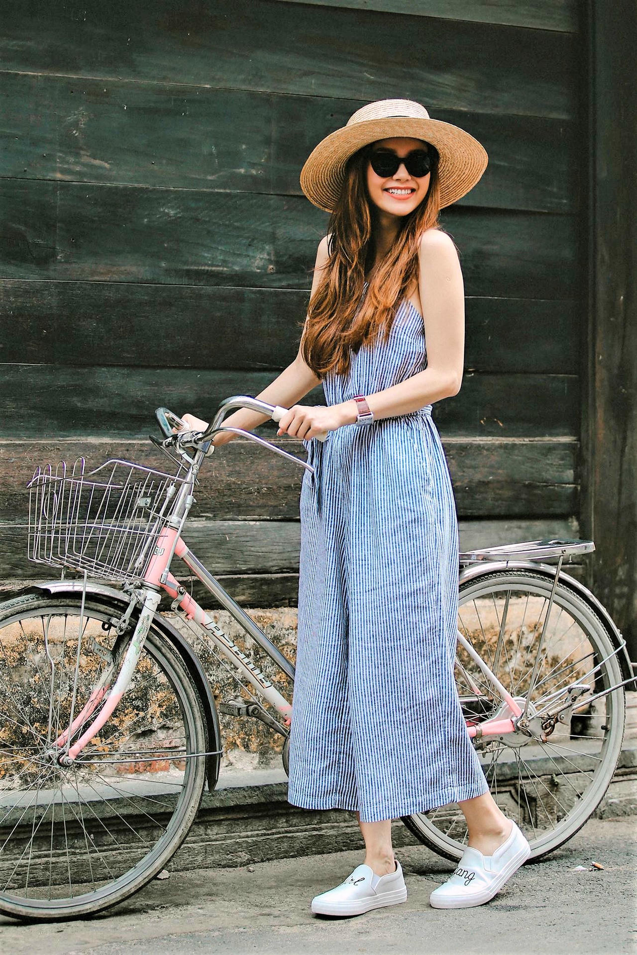 Nữ ca sĩ đáng yêu dạo phố trong bộ jumpsuit sọc xanh nhẹ nhàng của thương hiệu Old Navy. Không cần tạo ấn tượng bởi quá nhiều phụ kiện, chỉ cần đôi slip-on trắng giản đơn và mũ cói mộc mạc thôi đã đủ tạo nên vẻ đẹp trong sáng, ngọt ngào của Minh Hằng.
