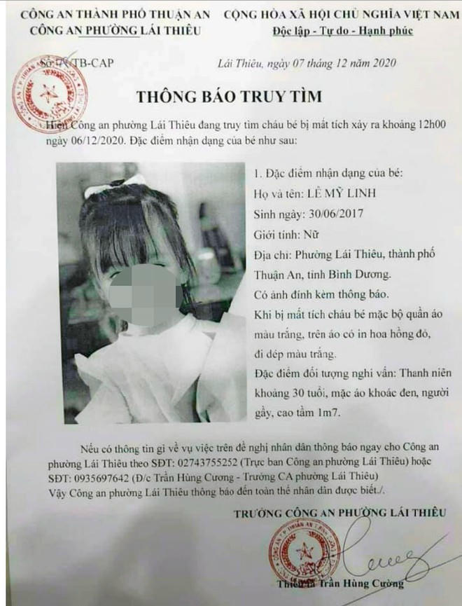 Tối 7/12, trên mạng xã hội lan truyền thông tin bé gái L.M.L (SN 2017, ngụ phướng Lái Thiêu) bị bắt cóc khi đang chơi trước cửa nhà vào ngày 6/12. Thông tin đăng tải hình ảnh của một bé gái là 1 văn bản truy tìm tung tích của Công an phường Lái Thiêu đề ngày 7/12 và do Thiếu tá Trần Hùng Cường ký.