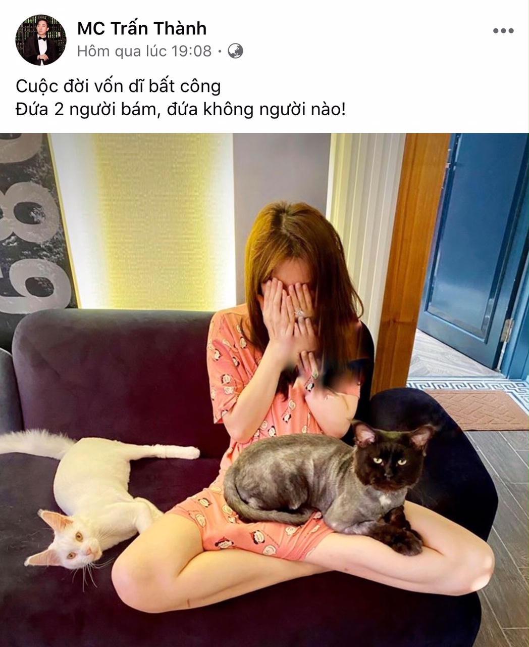 Cụ thể khi chia sẻ bức ảnh Hariwon tỉnh dậy bên cạnh 2 chú mèo cưng Trấn Thành dí dỏm: “Cuộc đời vốn dĩ bất công. Đứa 2 người bám, đứa không người nào!”.