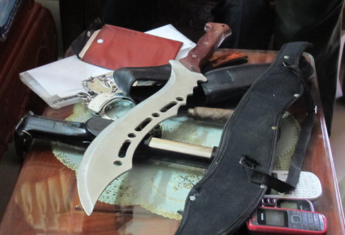 Trong quá trình khám xét, trên chiếc xe Toyota Land Cruiser Prado của bị can Thúy, lực lượng chức năng phát hiện một còng số 8, dùi cui điện, dao dài 58cm (cả cán), một dao bấm và một dao nhọn.