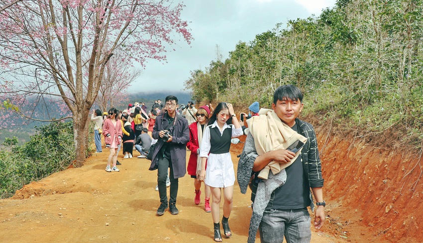 Trong mấy ngày gần đây, cánh rừng mai anh đào mọc tự nhiên, hàng chục năm tuổi trên núi Lang biang bung nở rộ. Bức tranh thiên nhiên đầy mê hoặc này đã “đốn tim” người dân bản địa và du khách thập phương. Bên cạnh đông đảo bạn trẻ tìm đến check-in, nhiều cặp đôi cũng chọn nơi đây để chụp ảnh cưới. Cánh rừng nổi tiếng này nằm ở phía tây ngọn núi Lang biang, cách trung tâm TP Đà Lạt gần 20km.
