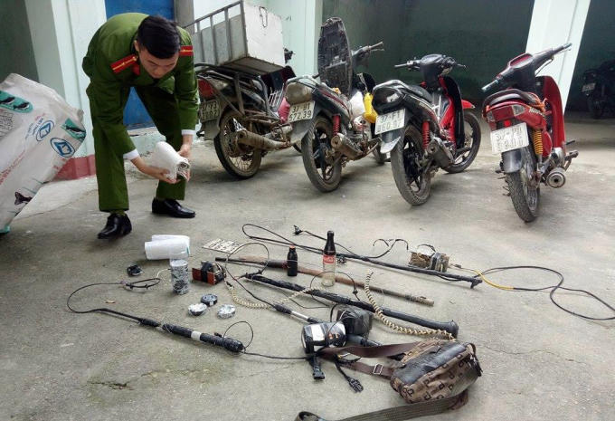Tại hiện trường, lực lượng chức năng thu giữ nhiều công cụ, phương tiện để thực hiện trộm chó gồm: 1 ô tô Fortuner biển số 37A - 221.82, 6 xe máy, 32 con chó (còn sống), 4 bộ kích điện, 3 chai bom xăng, 1 thanh kiếm…