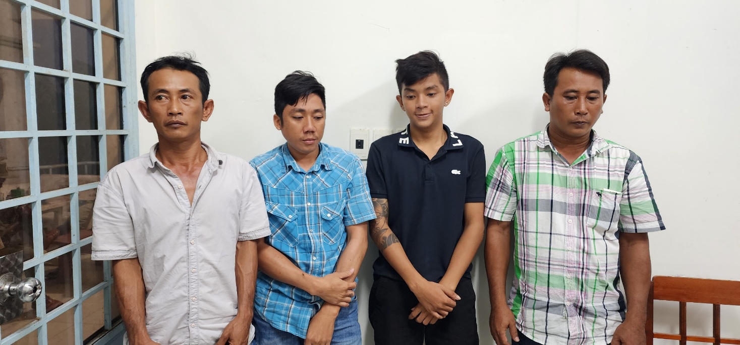 04 đối tượng Liêu Hoàng Phương, Huỳnh Minh Khanh, Danh Huỳnh Trung Hậu và Liêu Hoàng Vũ (bên phải sang) có vai trò tổ chức, canh đường, thu và chung tiền. |