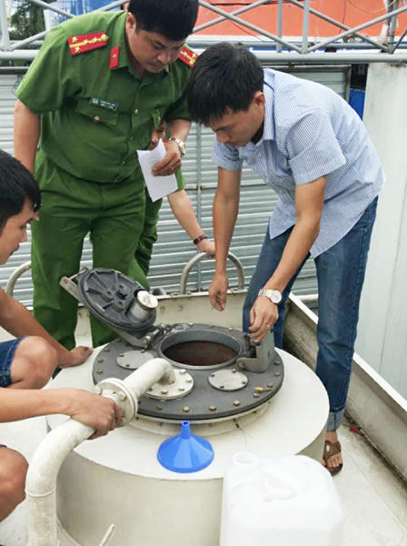 Theo đó, vào lúc 11h30 phút ngày 10/10 Phòng PC46 Công an Nghệ An phối hợp với Sở Khoa học công nghệ tỉnh Nghệ An và Kỹ thuật nghiệp vụ (Cục A71 Bộ Công an) ập vào bắt quả tang Cty TNHH Thanh Ngũ (xã Diễn Ngọc, Diễn Châu, Nghệ An) đang đổ dung môi trong bồn xe ô tô chở tẹc BKS 37C 7512 vào bồn xăng tại điểm kinh doanh xăng dầu bán cho khách hàng.