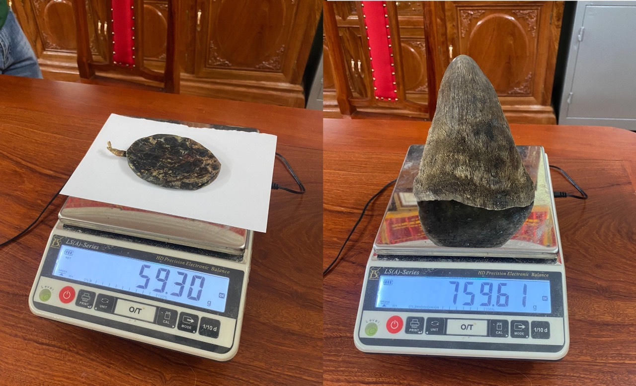 Tang vật là 01 túi mật có trọng lượng 59,3 gram (nghi mật Gấu), 01 sừng trọng lượng 759,6 gram (nghi là sừng tê giác Châu Á). Theo lời khai ban đầu của đối tượng, những tang vật này là mật Gấu và sừng Tê giác mua từ Lào về để bán kiếm lời.