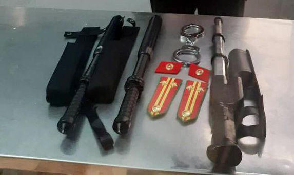 Khám xét nơi ở của Thành, lực lượng chức năng thu giữ 1 cặp phù hiệu Công an nhân dân, 1 cặp quân hàm Trung tá, 1 còng số 8 và 1 gậy điện, 2 đèn pin.