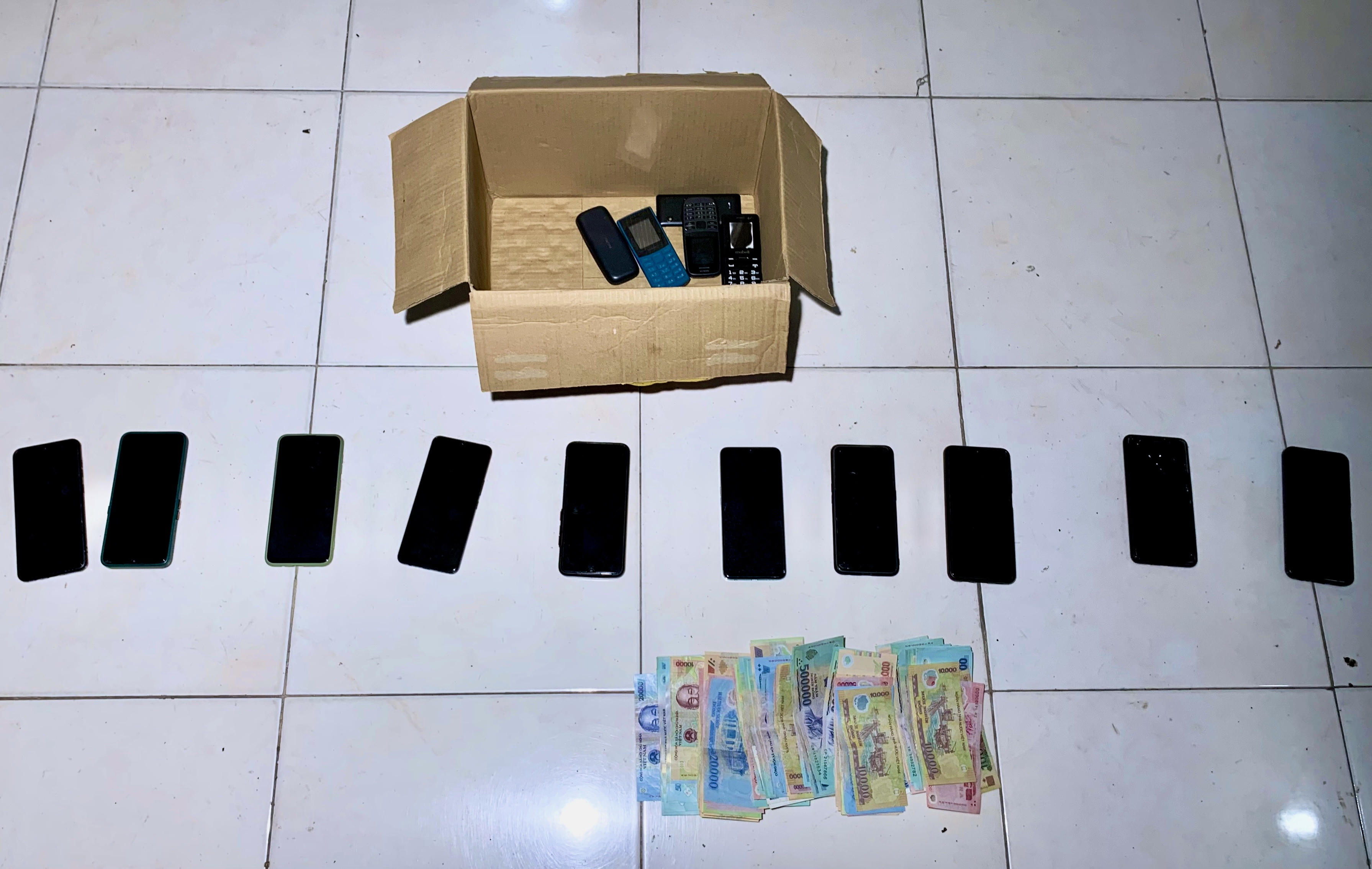 Tại hiện trường, lực lượng Công an tạm giữ: 14 điện thoại di động, số tiền gần 35 triệu đồng cùng một số tang vật khác có liên quan.