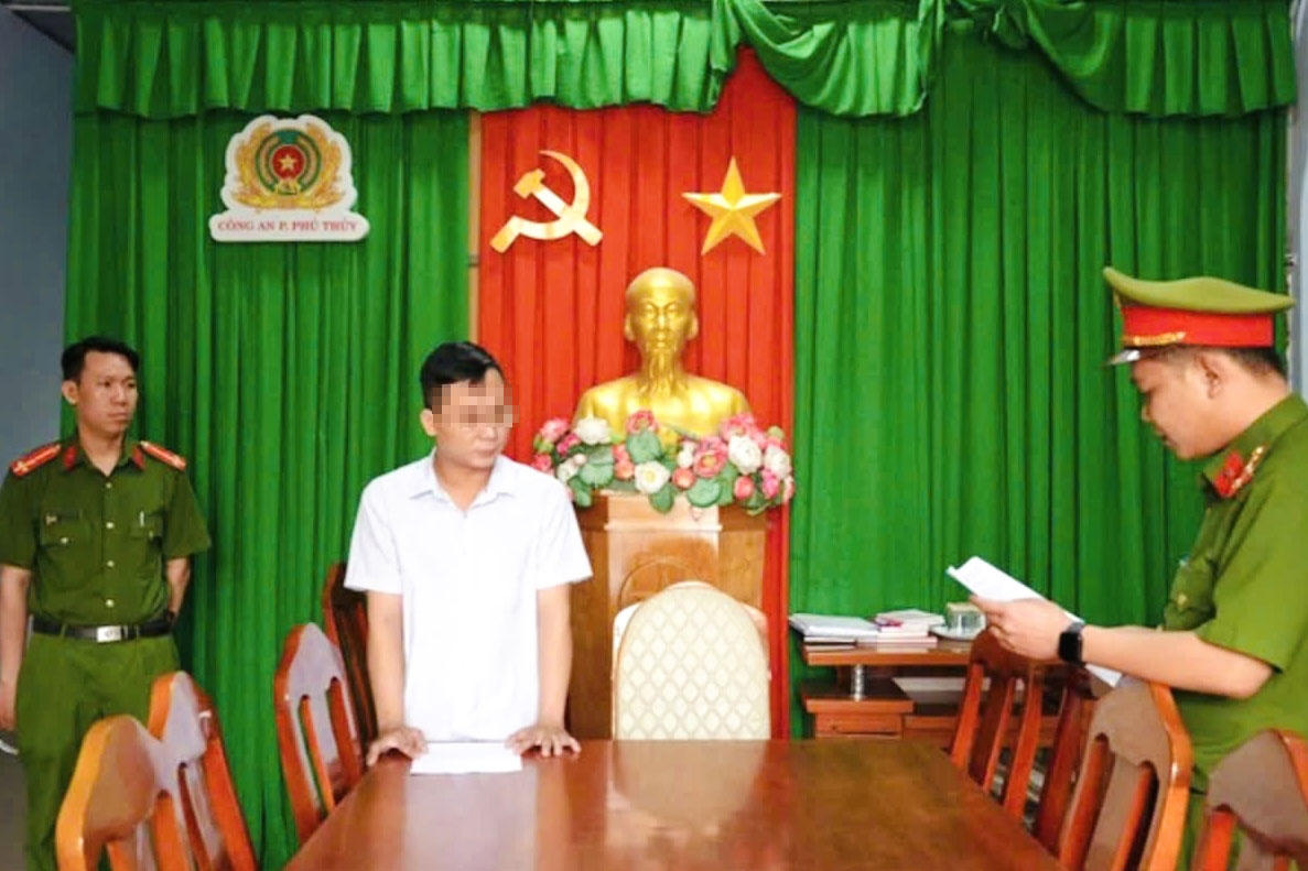 Đối tượng Phạm Thanh Tùng nghe cơ quan công an tống đạt các quyết định. |