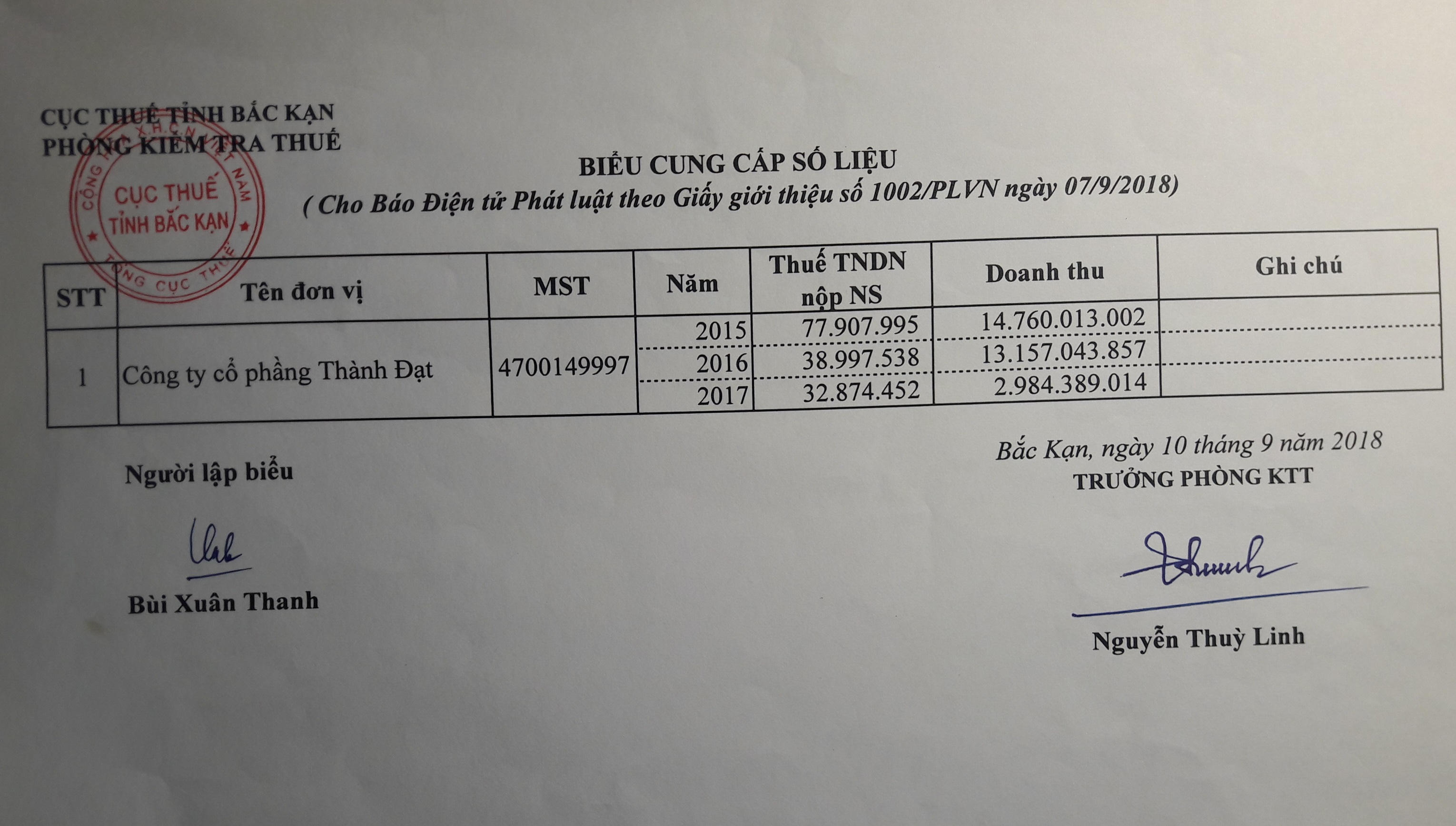 | Số liệu doanh thu của Công ty Thành Đạt được Cục thuế tỉnh Bắc Kạn quản lý, khác hẳn với số liệu do TAND tỉnh Bắc Kạn "xác minh" |