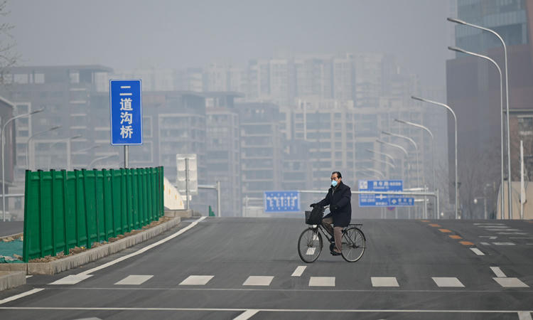 Người đàn ông đeo khẩu trang đạp xe trên phố không bóng người ở Bắc Kinh hôm 12/2. Ảnh:Washington Post. |