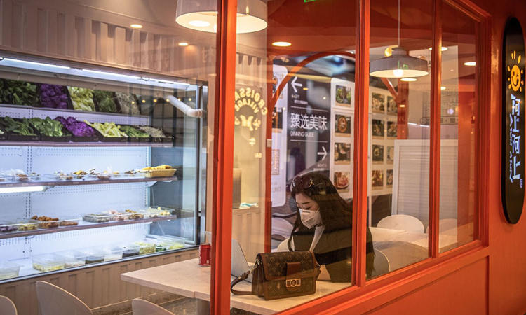 Người phụ nữ đeo khẩu trang ngồi một mình trong quán cà phê ở trung tâm thương mại Solana, Bắc Kinh hôm 12/2. Ảnh:Washington Post. |