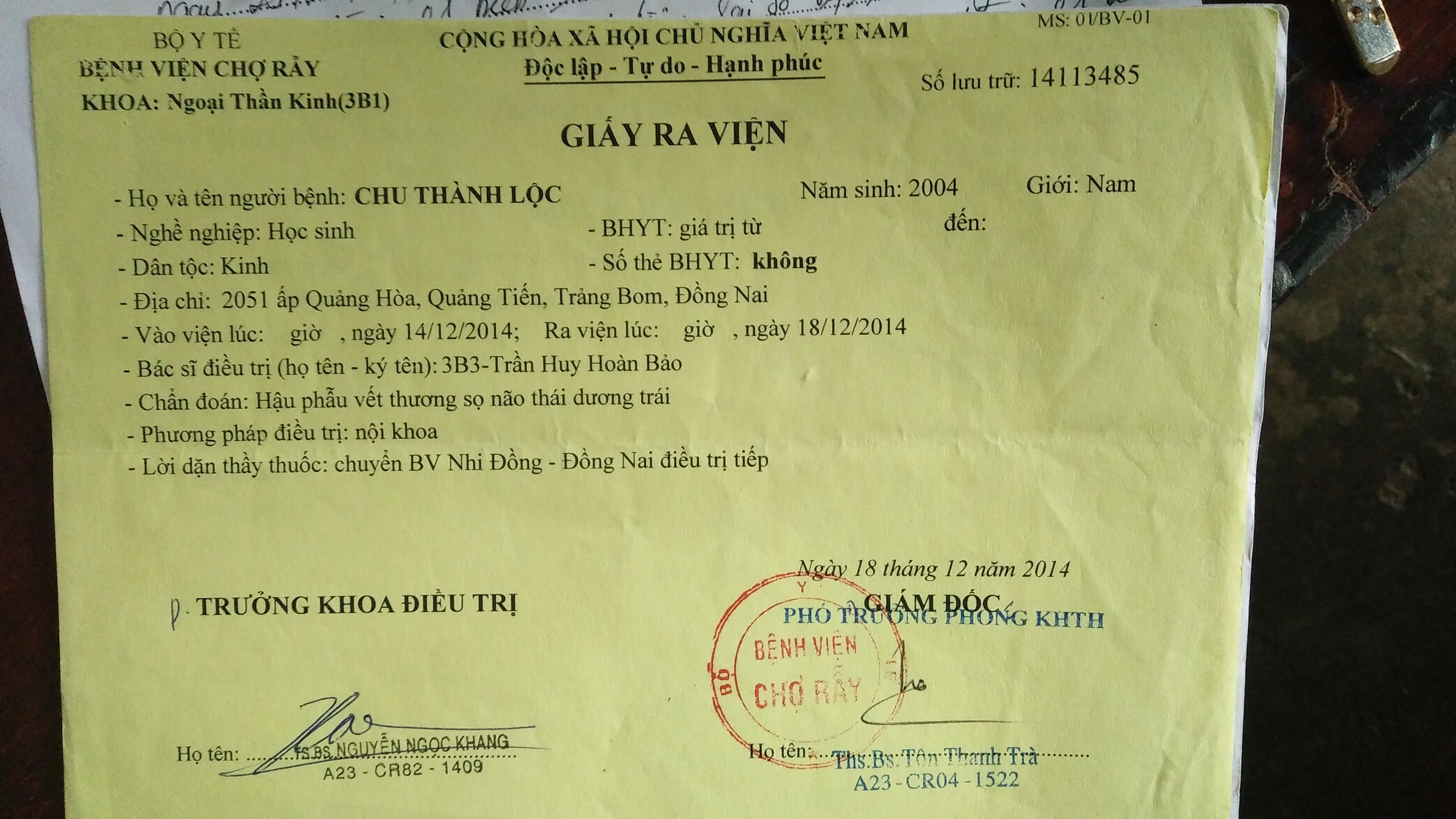 Do đi làm ca đêm, không có người thông báo nên mãi đến sáng ngày 13/12/2014, bà Bảy mới biết tin con bị tai nạn. “Tôi lên Bệnh viện Nhi đồng Đồng Nai thì thấy con hôn mê, bác sĩ nói khó lòng cứu chữa được do bị chấn thương nặng vùng đầu và não. Đến ngày 14/12/2014, con tôi được chuyển lên Bệnh viện Chợ Rẫy (TP HCM) để phẫu thuật”.