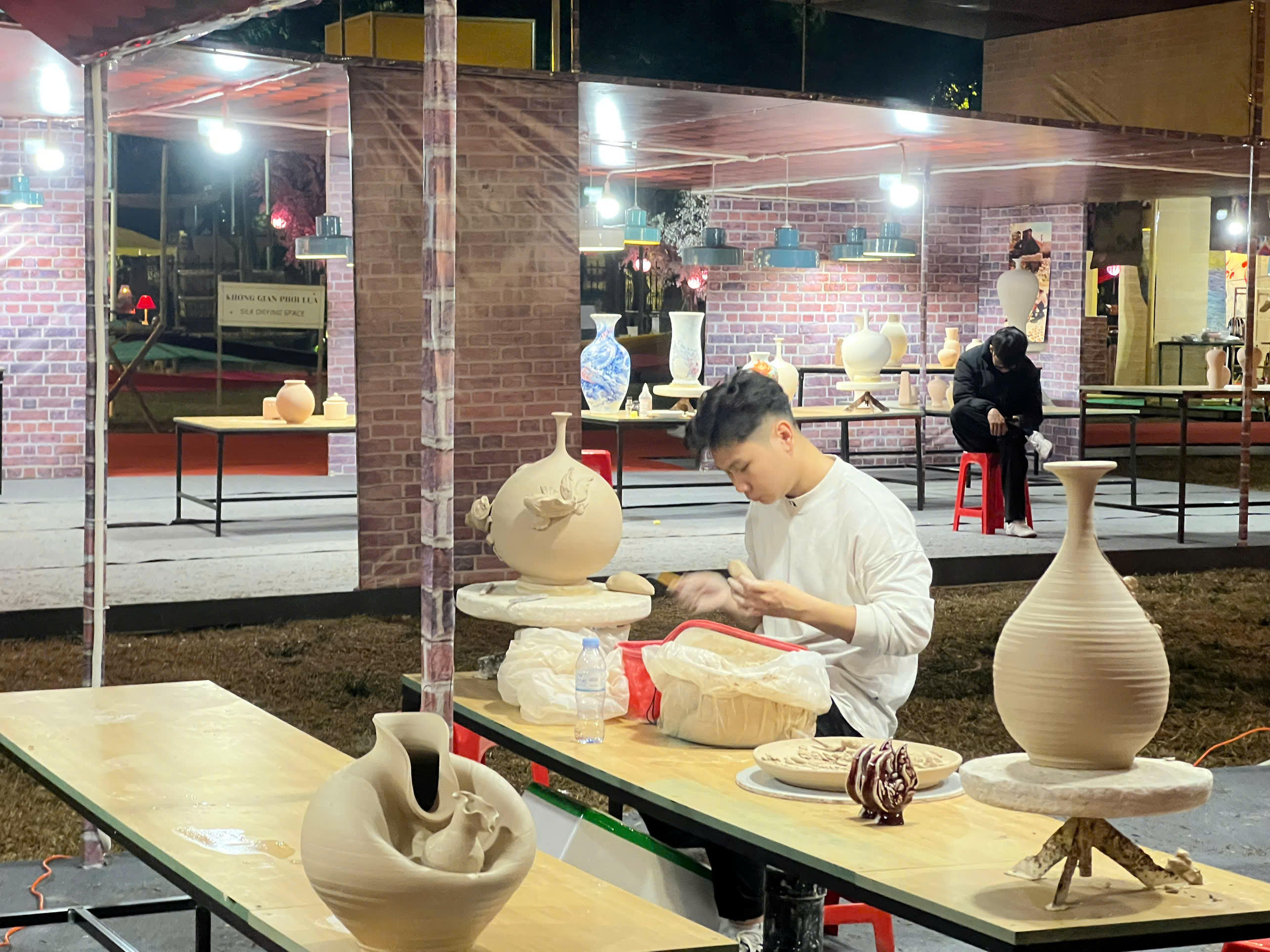 Bạn trẻ tham gia làm gốm sứ tại gian trưng bày sự kiện. |