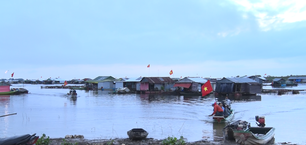 Màu cờ Tổ quốc Việt Nam đỏ rực một vùng sông, các hộ dân sinh sống trên làng bè tạm gác công việc đánh bắt cá, khoác trên mình những bộ đồ tươm tất. Làng bè sinh động hẳn lên dưới ánh ban mai, tiếng người chộn rộn gọi nhau đi bầu cử.