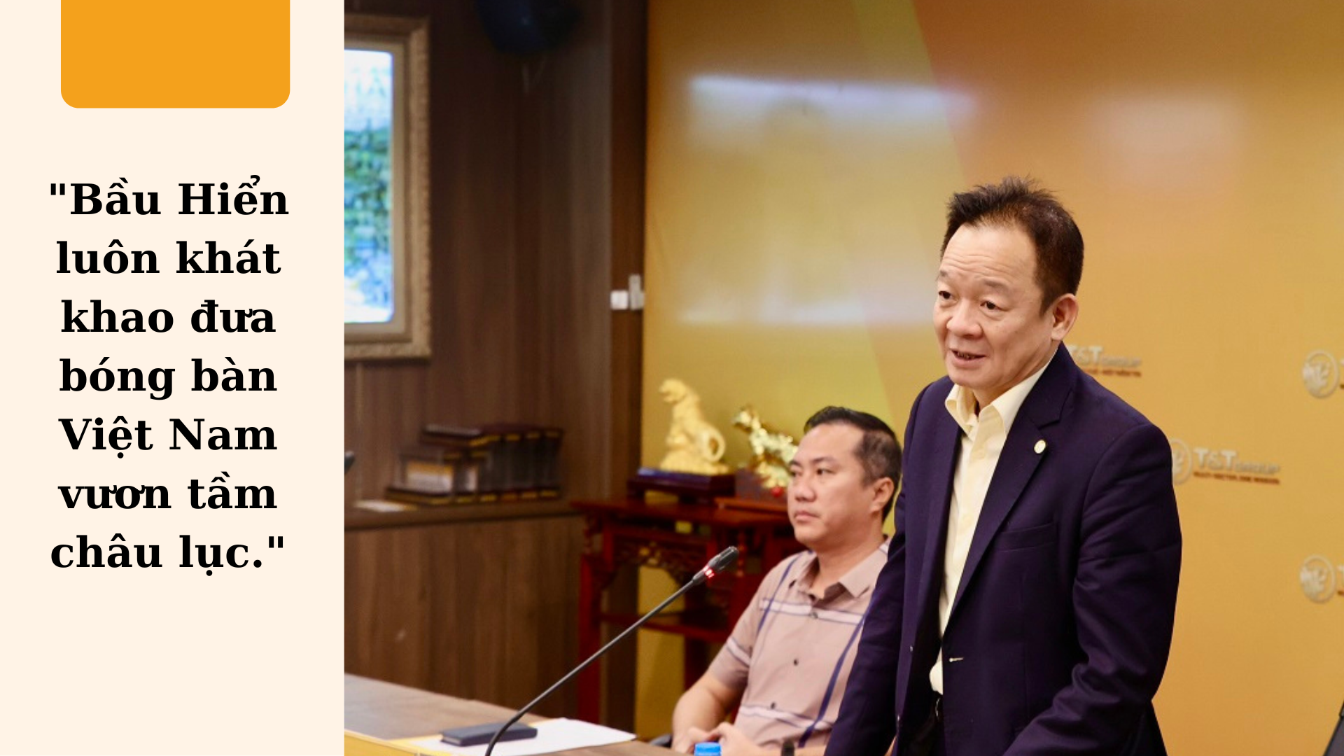 Trong buổi lễ vinh danh các vận động viên CLB bóng bàn Hà Nội T&T đạt thành tích xuất sắc tại SEA Games 32 với tổng số tiền thưởng lên tới 1,15 tỷ đồng dành cho Trần Mai Ngọc, Đinh Anh Hoàng, Lê Đình Đức, Ban huấn luyện đội tuyển Việt Nam và Ban huấn luyện CLB bóng bàn Hà Nội T&T, bầu Hiển hơn một lần thể hiện nỗi trăn trở với khát vọng làm sao để đưa bóng bàn Việt Nam vươn tầm châu lục.