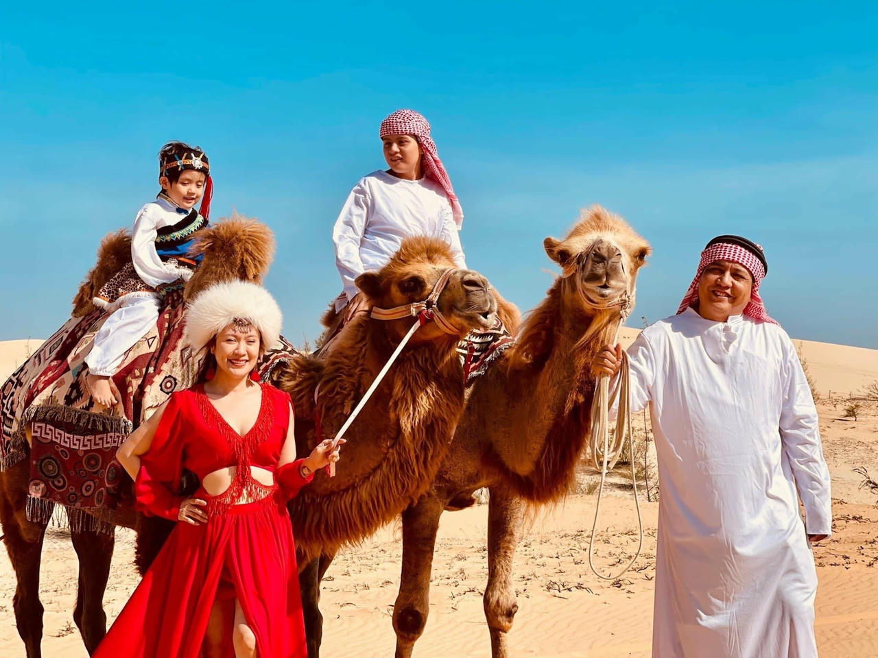 Du khách cưỡi lạc đà trên gió cát, một sản phẩm du lịch độc đáo tại KDL Bàu Trắng U&Me. |