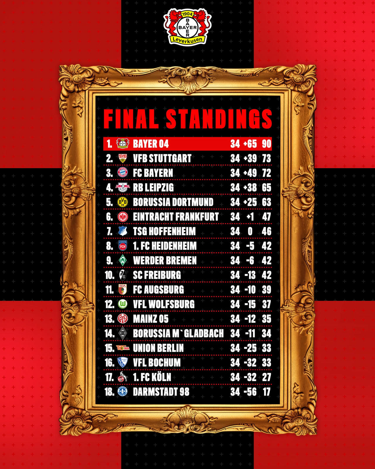 Bayern Leverkusen trở thành đội đầu tiên trong lịch sử Bundesliga vô địch mà không thua một trận nào trong suốt 34 vòng. Trong lịch sử các giải vô địch quốc gia châu Âu, thầy trò Xabi Alonso đã tiếp nối lịch sử của sau AC Milan (1991/92), Arsenal (2003/04), Juventus (2011/12), giành chức vô địch bất bại. Đây là một kỷ lục đáng ngưỡng mộ trong một giải đấu khốc liệt như Bundesliga.