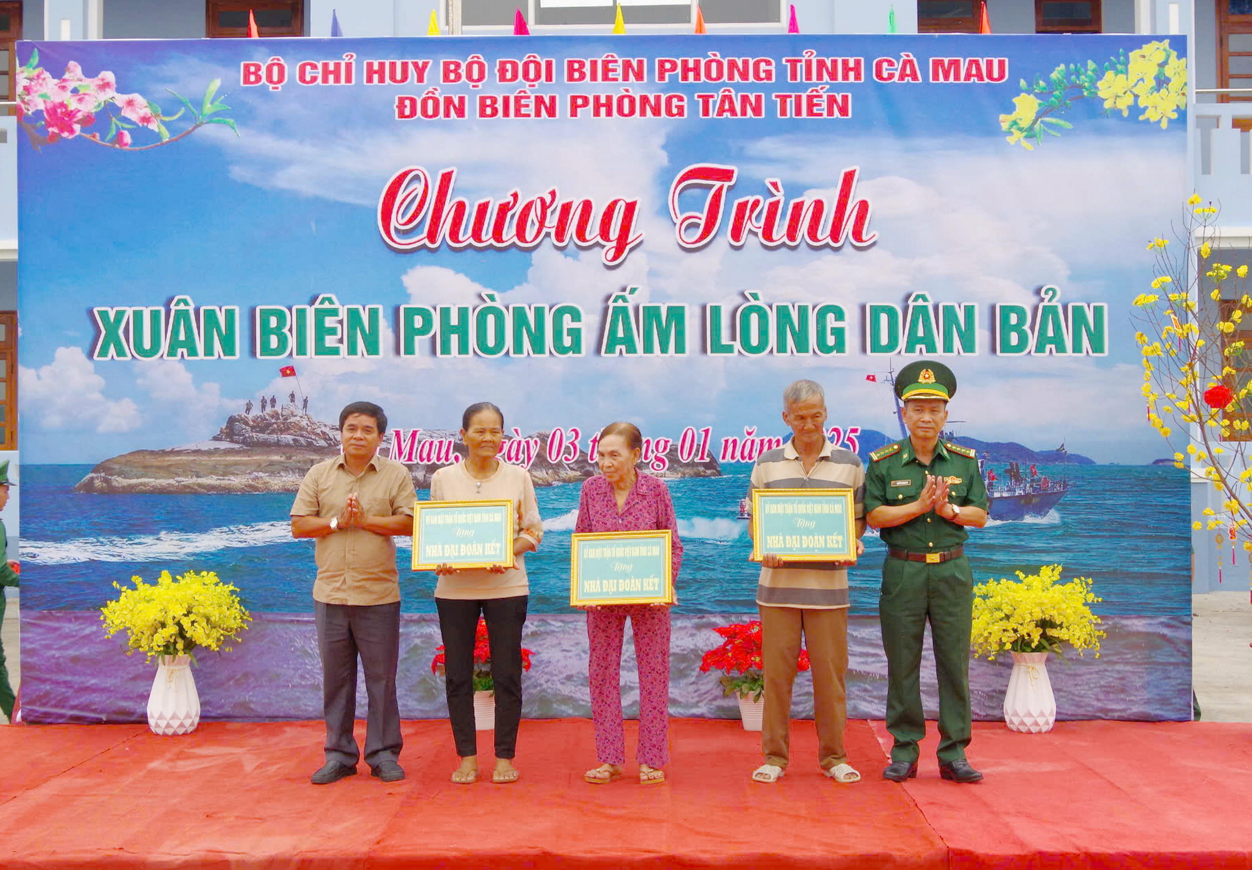 Đại tá Nguyễn Quang Hà - Phó Chính ủy BĐBP tỉnh Cà Mau và lãnh đạo huyện Đầm Dơi tặng Nhà Đại đoàn kết cho người nghèo, hộ gia đình có hoàn cảnh khó khăn. |
