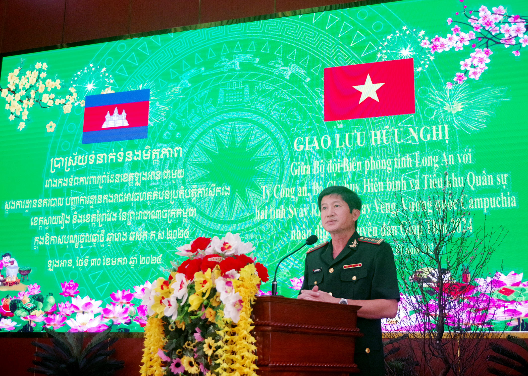 (PLVN) - Ngày 30/01, Bộ đội Biên phòng (BĐBP) tỉnh Long An tổ chức giao lưu hữu nghị với Ty Công an, Bộ Chỉ huy Hiến binh và Tiểu khu Quân sự hai tỉnh Svay Rieng và Pray Veng (Vương quốc Campuchia) nhân dịp Tết Nguyên đán Giáp Thìn năm 2024.