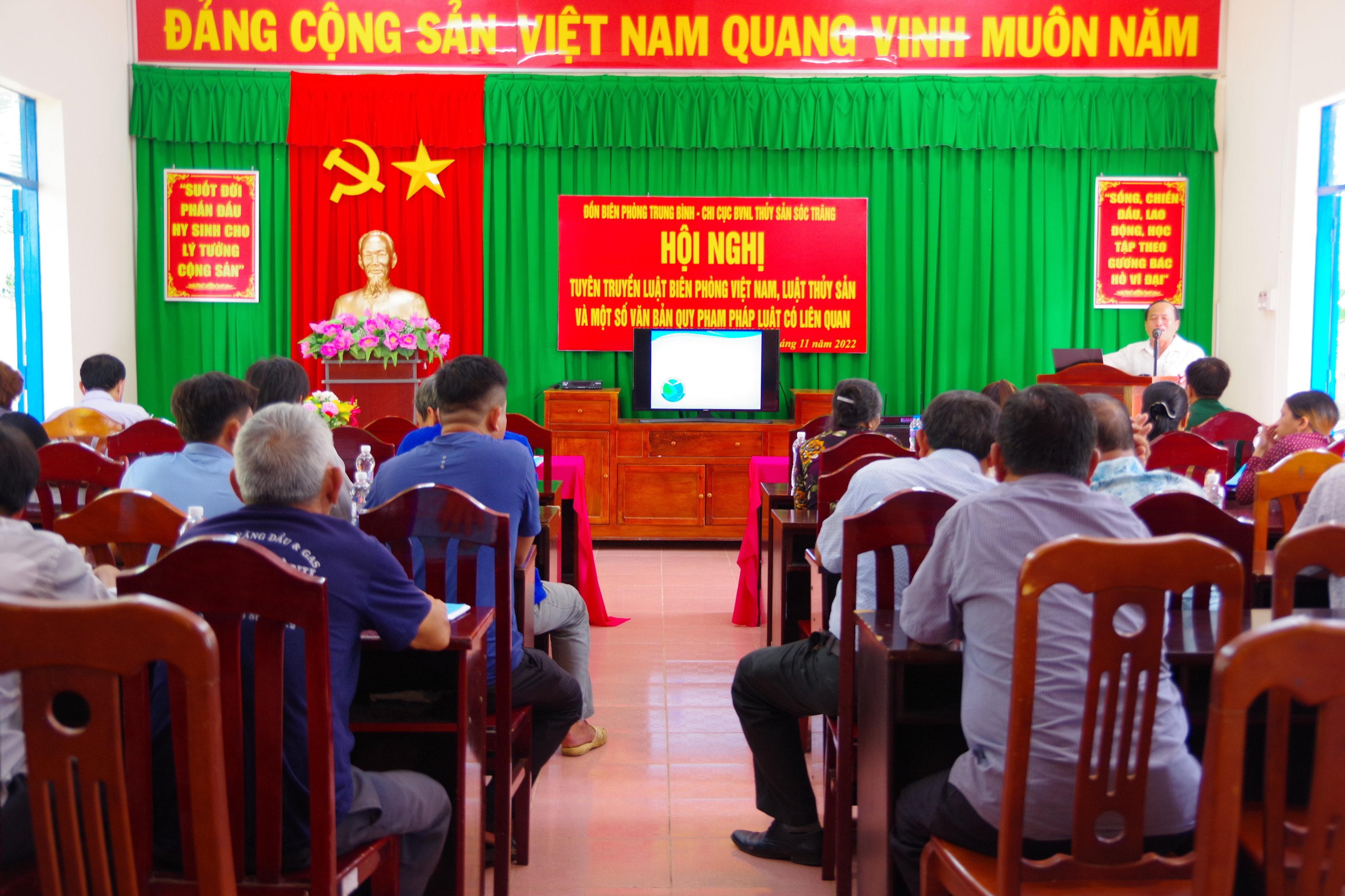 Nhằm hưởng ứng 10 năm Ngày Pháp luật Việt Nam, Đồn Biên phòng Trung Bình, BĐBP tỉnh Sóc Trăng đã phối hợp với Chi cục khai thác và bảo vệ nguồn lợi Thủy sản tỉnh Sóc Trăng tổ chức hội nghị tuyên truyền Luật Biên phòng Việt Nam năm 2020, Luật thủy sản năm 2017 và một số văn bản quy phạm pháp luật có liên quan cho các chủ phương tiện, thuyền trưởng, máy trưởng và bà con ngư dân trên địa bàn đơn vị quản lý.