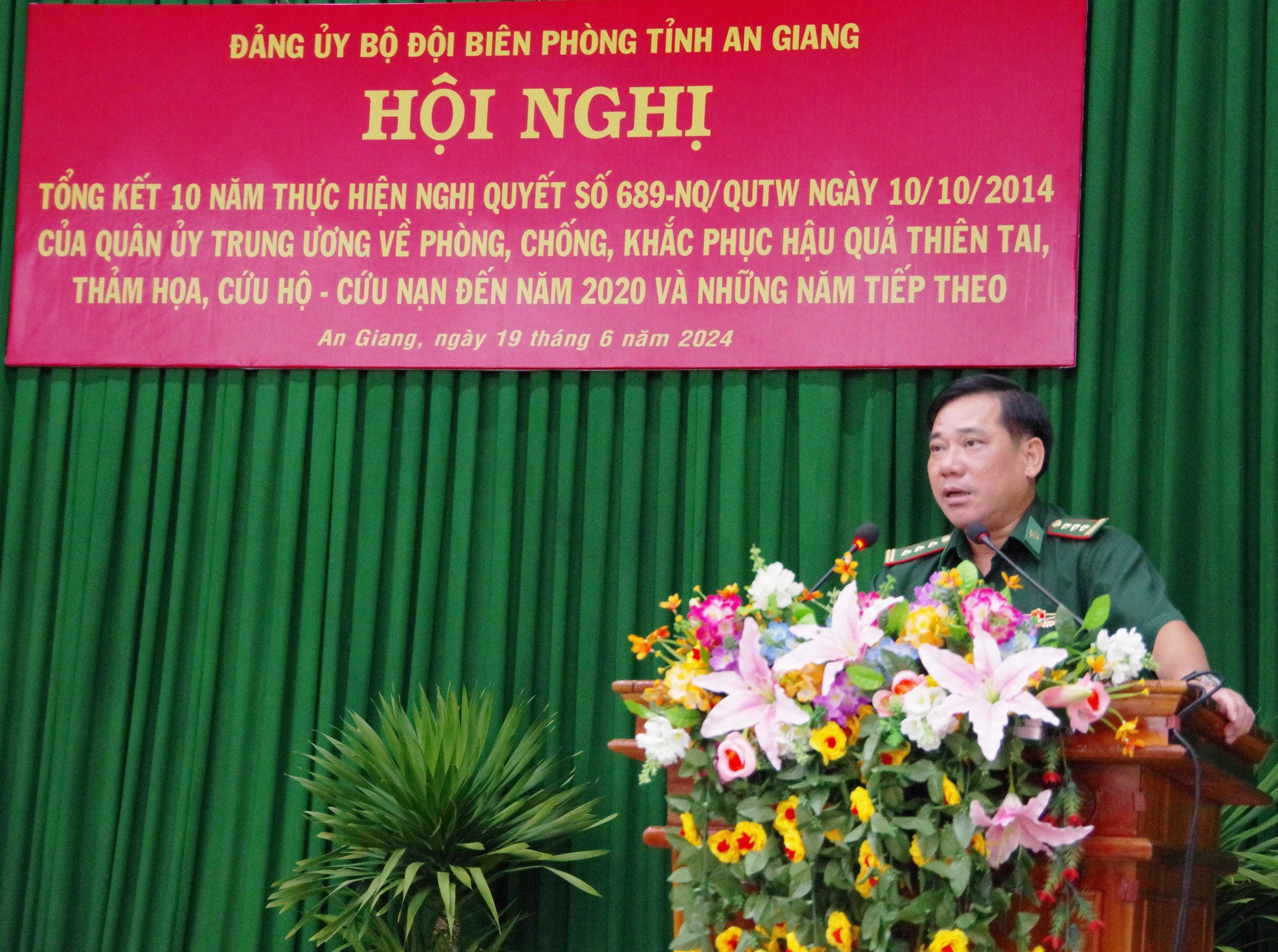 (PLVN) - Ngày 19/6, Đảng ủy Bộ Chỉ huy Bộ đội Biên phòng (BĐBP) tỉnh An Giang tổ chức Tổng kết 10 năm thực hiện Nghị quyết số 689-NQ/QUTW ngày 10/10/2014 của Quân ủy Trung ương về phòng, chống, khắc phục hậu quả thiên tai, thảm họa, cứu hộ - cứu nạn đến năm 2020 và những năm tiếp theo.