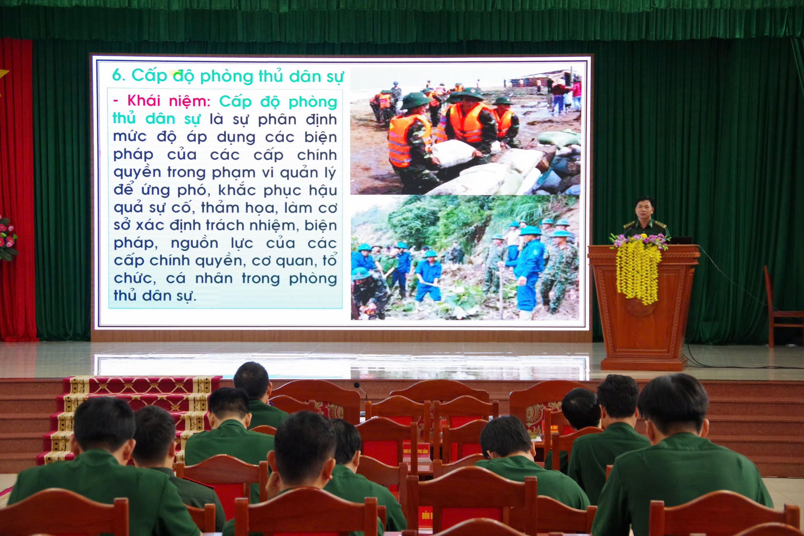 | Thượng tá Phạm Văn Tám - Phó Tham mưu trưởng, kiêm Trưởng ban Tác huấn BĐBP tỉnh giới thiệu tổng quan về Luật Phòng thủ dân sự tại lớp tập huấn. |
