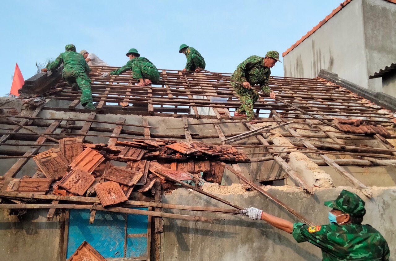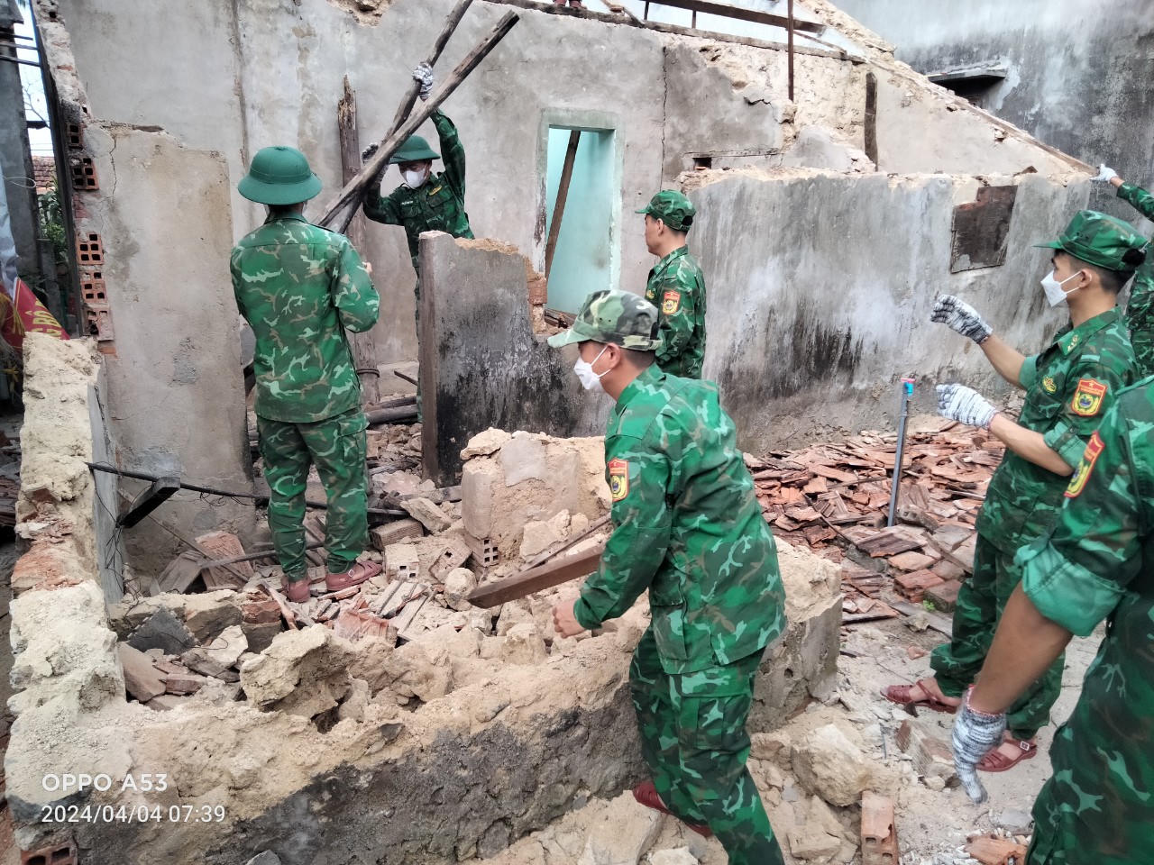 Cán bộ, chiến sĩ Đồn Biên phòng Nhơn Châu giúp đỡ hộ nghèo xây dựng nhà Đại đoàn kết |