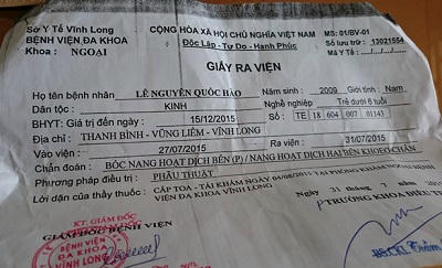 Ngày 5/8, tiếp xúc với PV, anh Lê Quốc Dũng, ngụ xã Thanh Bình, huyện Vũng Liêm (Vĩnh Long) phản ánh: sáng 27/7, anh đưa con trai là Lê Quốc Hào (6 tuổi) đến BV Đa khoa tỉnh Vĩnh Long thăm khám vì bị đau ở khoeo chân trái.