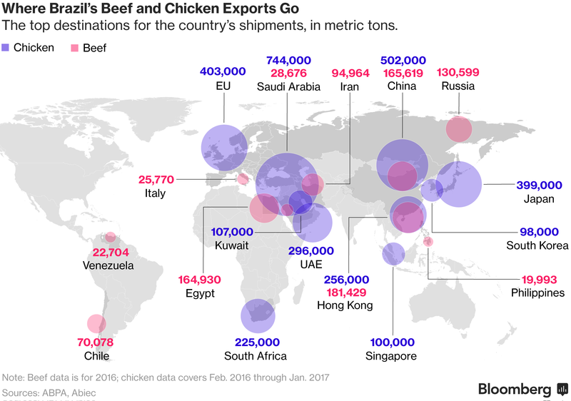 Với khoảng 4.000 nhà máy giết mổ và sản xuất thịt, Brazil hiện là nước xuất khẩu thịt gia súc và gia cầm lớn nhất thế giới. Các sản phẩm thịt của Brazil được xuất khẩu tới hơn 150 nước trên thế giới, trong đó ngoài các thị trường nói trên thì Nhật Bản, Ả rập Xê-út và Nga cũng là các thị trường lớn. ưTheo thống kê của Chính phủ Brazil, doanh số bán hàng các mặt hàng gia cầm của nước này trong năm 2016 đạt mức 5,9 tỉ USD và thịt gia súc đạt 4,3 tỉ USD. Doanh thu xuất khẩu mặt hàng thịt chiếm khoảng 7% tổng giá trị hàng xuất khẩu và chiếm 0,7% GDP của Brazil. Tổng cộng có 6 triệu người Brazil đang làm việc trong ngành công nghiệp chế biến thịt.