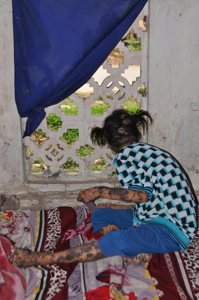 Mỗi lần thấy cháu bị bạn trong làng đi qua chọc ghẹo có làn da trâu, nhìn những vết bớt của cháu, lòng bà quặn thắt: “Có lần soi mình trong gương, con bé quay lại nói với tôi: “Sao con không giống mọi người”, tôi chỉ biết ôm cháu vào lòng rồi quay mặt đi chỗ khác mà khóc”.