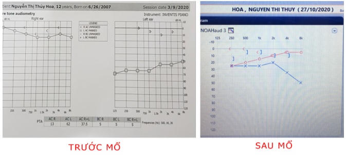 Hiện tại, kết quả sau 3 tháng tạo hình xương con, sức nghe cải thiện gần như bình thường, giờ đây bé có thể tự tin đi học và hòa nhập với cuộc sống.