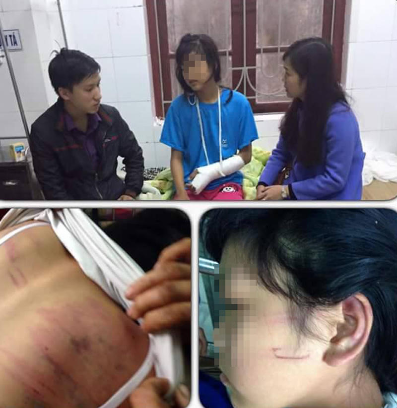 Qua kiểm tra, người em T. chằng chịt vết đánh bầm tím ở cánh tay, lưng, mông. Ngoài ra, em T. còn bị rạn xương tay, các bác sĩ phải bó bột cho em.