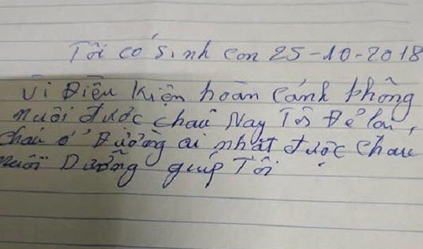 Cạnh bé là một chiếc giỏ, trong có mẩu giấy ghi “Tôi có sinh con 25/10/2018. Vì điều kiện hoàn cảnh không nuôi được cháu, nay tôi để lại cháu ở đường, ai nhặt được cháu nuôi dưỡng giúp tôi".