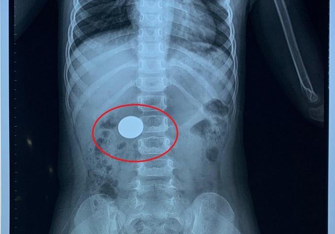 Trước đó, khoảng 10h sáng 14/12, bệnh viện tiếp nhận bé N trong tình trạng nuốt phải dị vật là đồng xu trong ổ bụng.