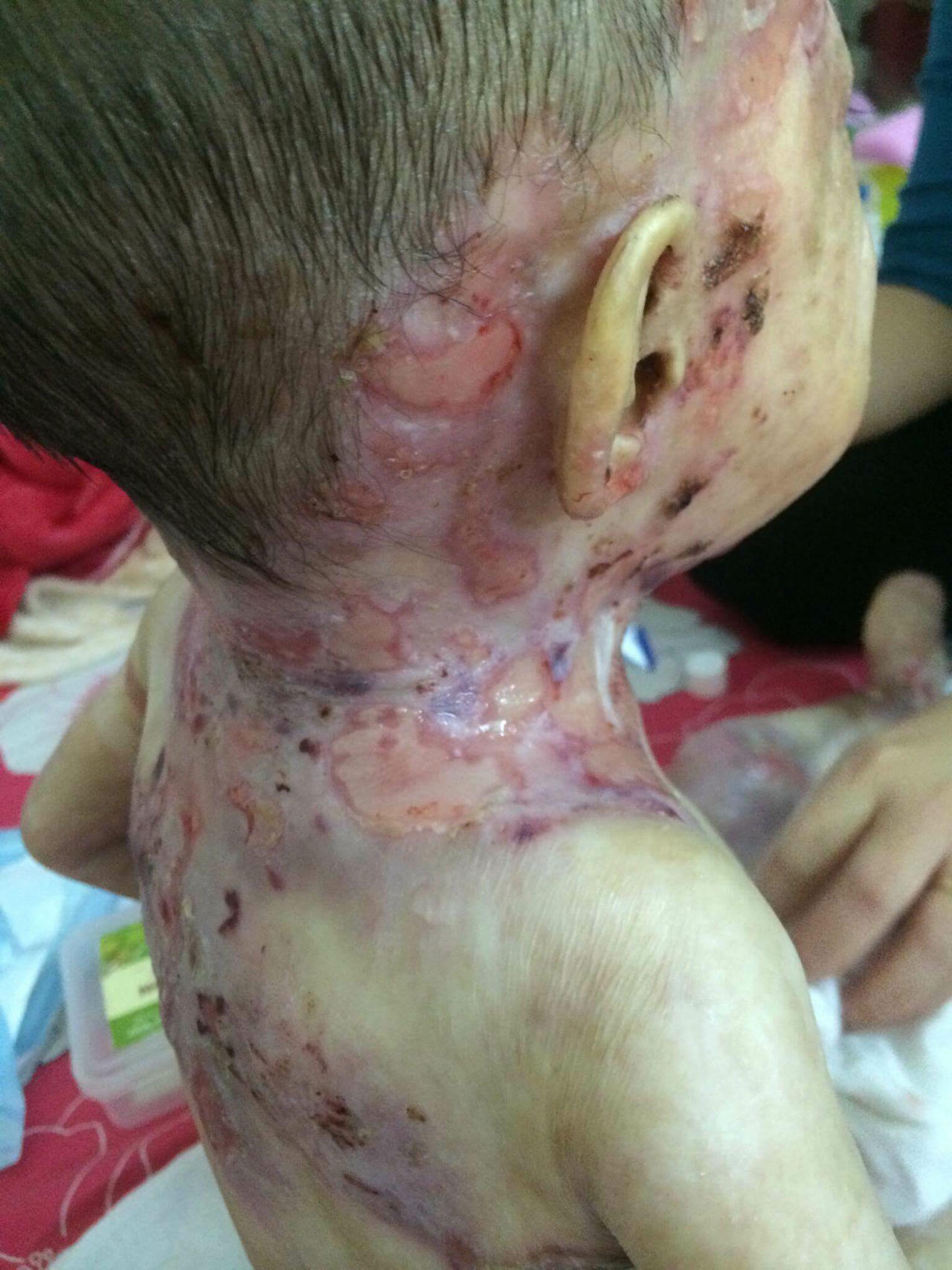 Thậm chí, theo chia sẻ của mẹ cháu, những mảng da của bé cũng rất yếu, chỉ cần tác động, va chạm nhẹ là có thể bị trầy tróc rất đáng thương. Những vết lở loét, bọng nước vỡ ra khiến cơ thể bé An Khanh rất đau và rát.