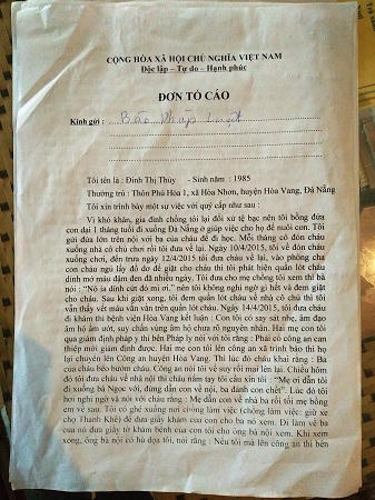 Từ lời kể của con, một lần nữa, chị T làm đơn tố cáo gửi lên Cơ quan Công an huyện Hòa Vang. Trong lúc sự việc chưa được giải quyết, ngày 27/12/2015 (Âm lịch), khi tắm cho con, chị phát hiện trên cánh tay của cháu Q có một vết bầm.