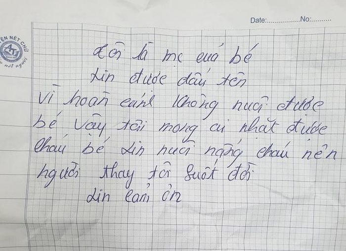 Bức thư với nội dung: “Tôi là mẹ của cháu bé, xin được giấu tên. Vì hoàn cảnh không nuôi được bé, vậy tôi mong ai nhặt được cháu bé xin nuôi nấng cháu nên người. Xin cảm ơn!”.