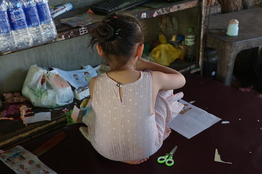 11h, trong quán ăn nhỏ ngột ngạt, nóng bức nằm trên đường Quang Trung, TP. Vinh (Nghệ An), cháu Nguyễn Băng Th. (SN 2013) đang lủi thủi cùng bà nội và người cô ruột. Không có bạn chơi, cô bé tự mang tranh ảnh ra cắt dán vào quyển sách của mình. Nhìn cháu, bà nội Nguyễn Thị Nhung (SN 1964) xót xa: “Lẽ ra bây giờ cháu tôi đang học trên lớp cùng các bạn, đằng này nó phải ngồi ở nhà chơi một mình vì bị nhà trường đột ngột đuổi học. Một đứa trẻ đang tuổi mầm non có tội chi đâu mà nhà trường lại hành xử như vậy”.