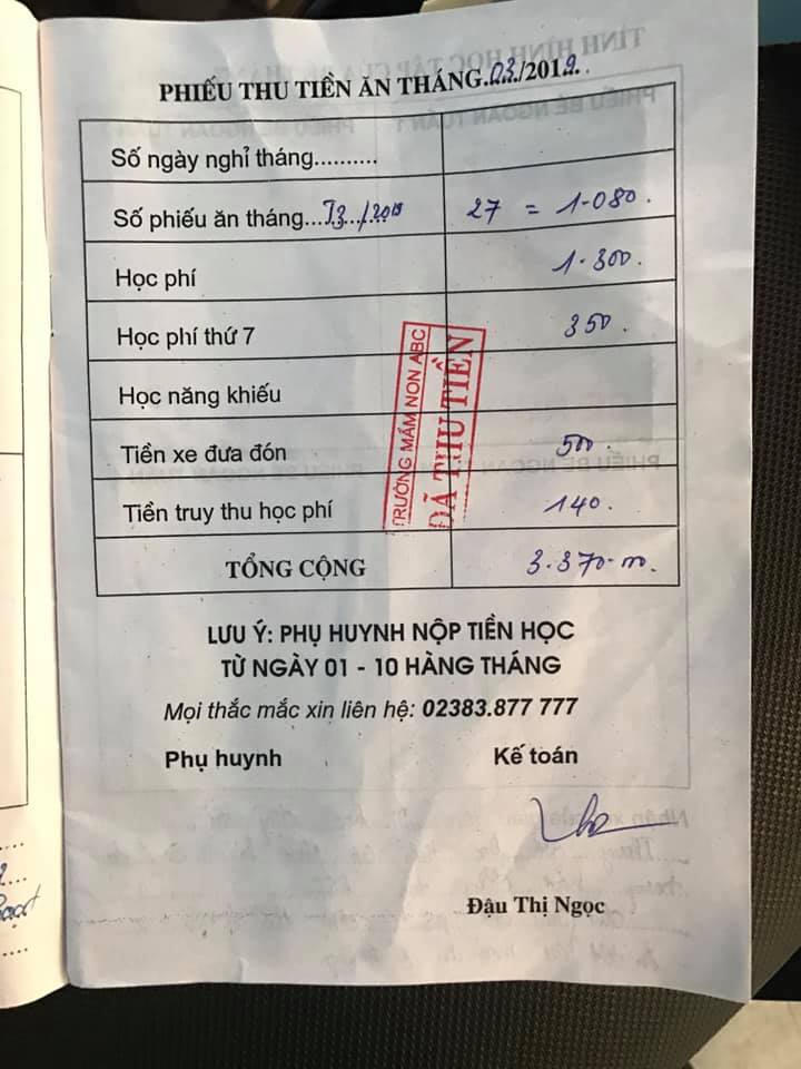 Trong khi đó, trang facebook cá nhân được cho là của bà H.S. - chủ trường mầm non ABC đăng tải thông tin: sáng 8/4 có hai người thân của bé Th. lần đầu tiên xuất hiện tại trường, vì không phải là phụ huynh bé Th. nên nhà trường không giải trình. “Trong sổ đóng tiền của bé Th. chữ ký không phải của kế toán. Nếu phụ huynh đi nộp tiền học sẽ có phiếu thu tiền có chữ ký phụ huynh, ký xác nhận tiền ăn để trường lên nộp Phòng Giáo dục và đào tạo TP Vinh”, tài khoản mang tên H.S. viết.