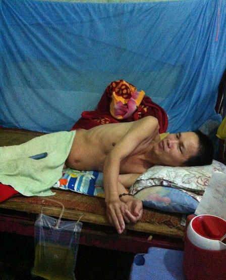Trở mình khó nhọc trên chiếc giường sắt cũ kỹ kê giữa nhà, anh Chung tâm sự: “Năm 2009 trong một lần đi dỡ nhà cũ thuê, tôi không may dẫm phải cây đòn tay mục nên ngã từ trên cao xuống, trọng thương. Để có tiền đi bệnh viện chữa trị, vợ chồng quyết định bán hết của cải và căn nhà vừa mới xây với giá 35 triệu đồng.