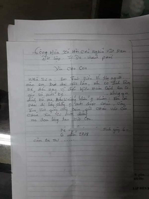 Nhà chùa kiểm tra túi đồ mà cô gái trẻ để lại thì thấy một lá thư với nội dung: “Xin cho con. Nhà sư ạ. Em sinh viên vì tin người nên em trót dại một lần sinh ra bé này. Đến nay, vì điều kiện hoàn cảnh em cố giữ và nuôi bé nhưng gia đình bố mẹ anh ấy không nhận. Em còn phải đi lấy chồng không nuôi được cháu. Em viết giấy này xin gửi cháu vào cửa chùa, xin sư nuôi dưỡng. Mẹ đau lòng tạm biệt con. Bé N.G.H, sinh ngày 6/6/2018. Cảm ơn sư…”.