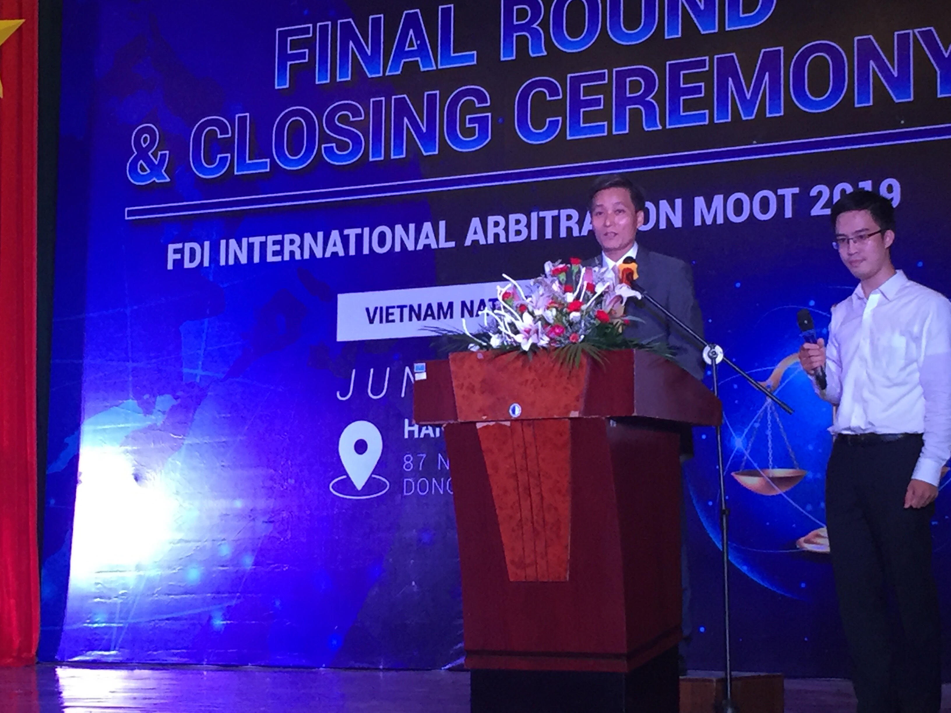 Phát biểu khai mạc, TS. Trần Quang Huy - Phó Hiệu trưởng phụ trách Trường ĐH Luật Hà Nội khẳng định nhà trường luôn chú trọng, khuyến khích tổ chức các cuộc thi để tạo cơ hội cho các em sinh viên được trải nghiệm, học hỏi kiến thức và kỹ năng. Cuộc thi FDI MOOT năm 2019 thu hút 14 đội thi đến từ 11 cơ sở đào tạo luật trên cả nước. Trải qua gần 1 năm với 34 trận đấu, đội thi của Trường Đại học Luật Hà Nội (RIGAUX) đã xuất sắc đạt giải Nhất và Đại học Ngoại thương (GUGGENHEIM) đã giành giải nhì Vòng thi Quốc gia FDI Moot 2019. Lãnh đạo Nhà trường mong muốn 2 đội thi sẽ tiếp tục nỗ lực, chuẩn bị tốt nhất cho cuộc thi cấp khu vực diễn ra vào tháng 8/2019 và cuộc thi toàn cầu diễn ra vào cuối năm nay.