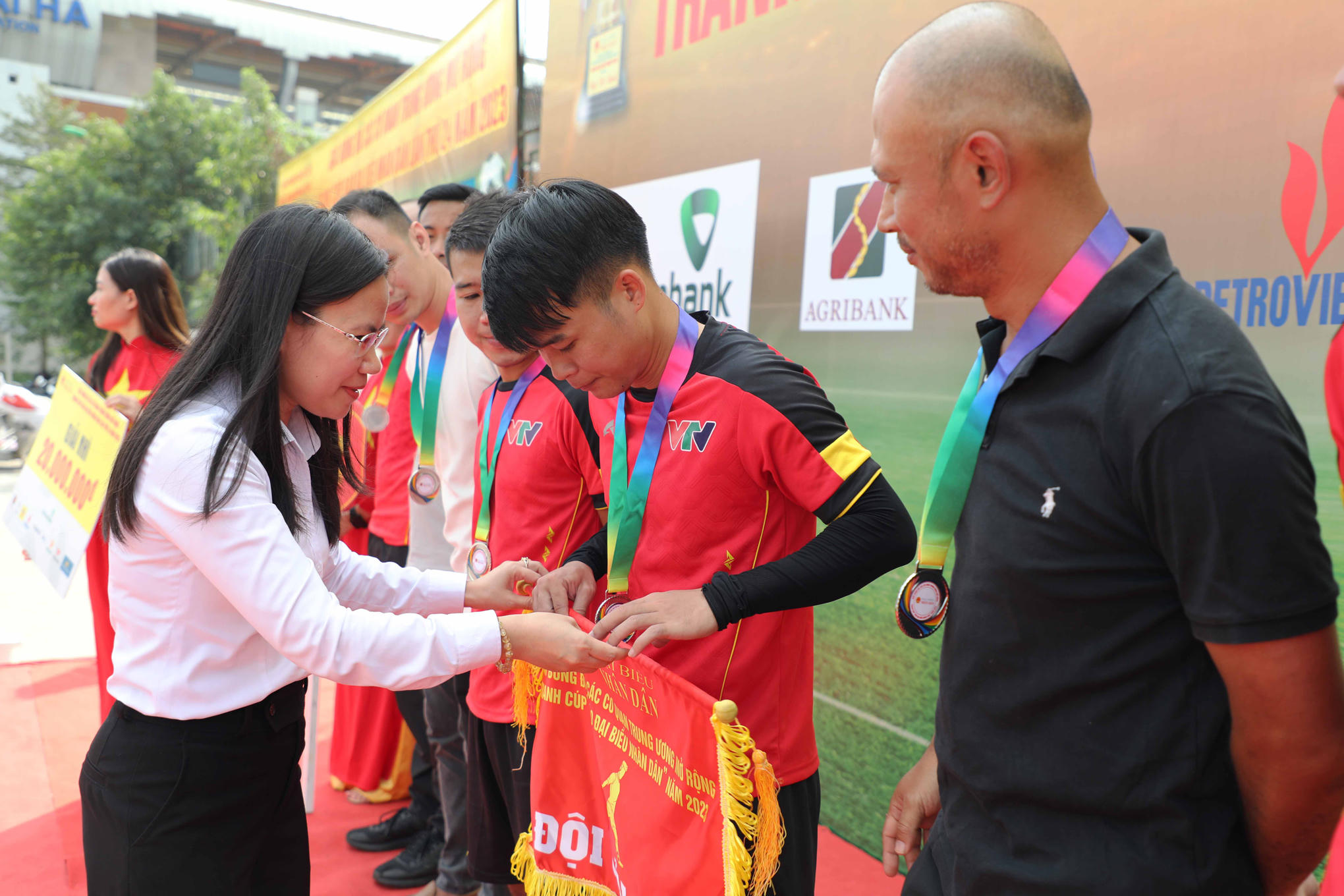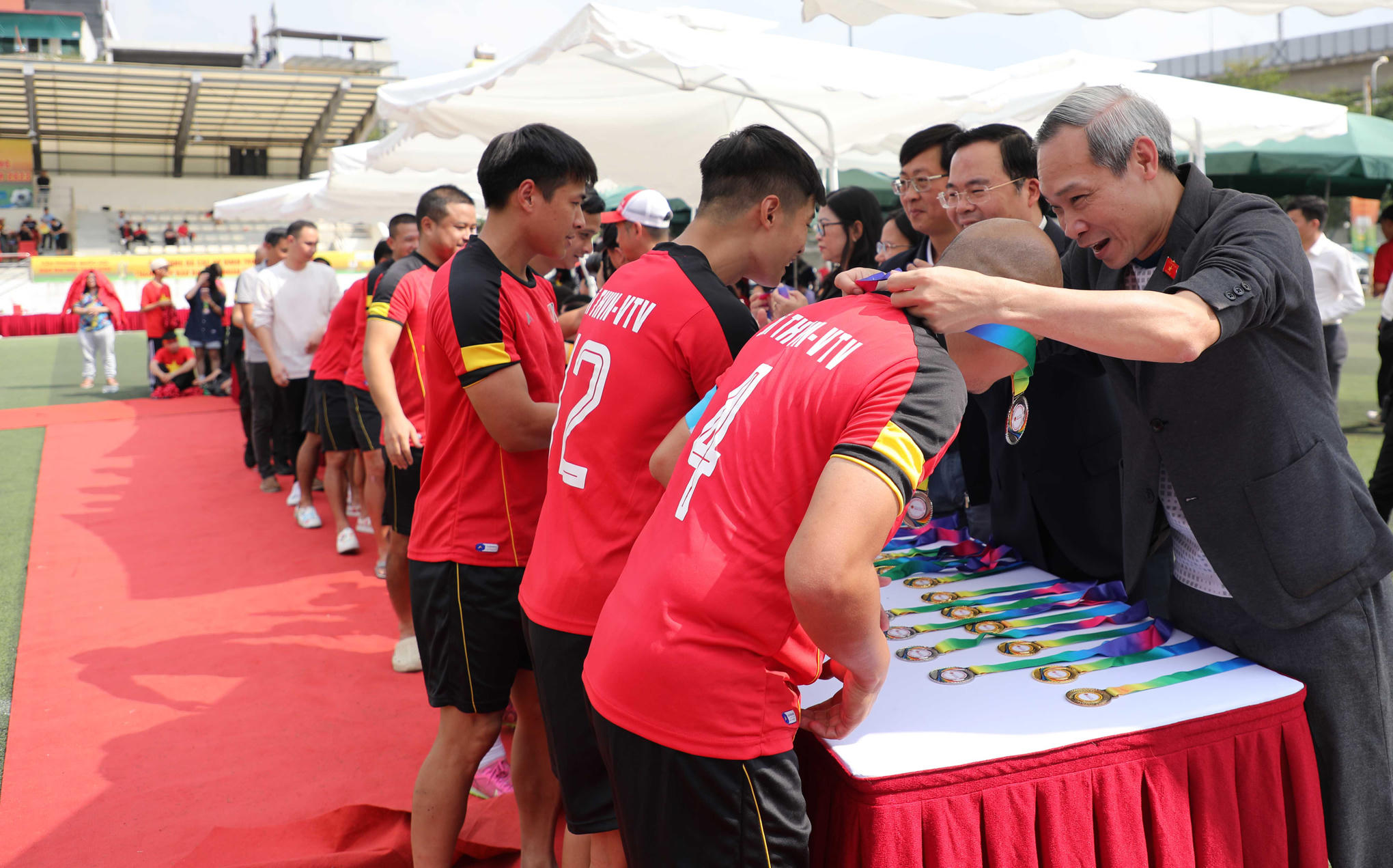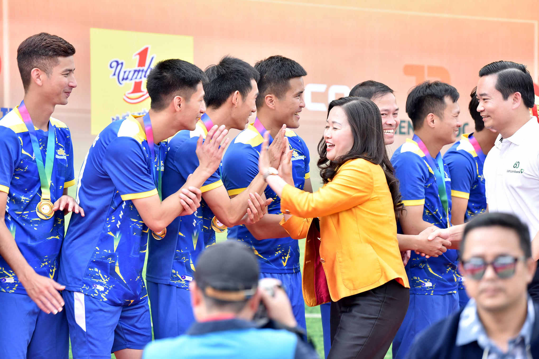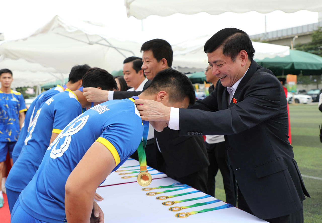 Tổng Thư ký Quốc hội, Chủ nhiệm Văn phòng Quốc hội Bùi Văn Cường trao huy chương Vàng cho đội bóng Vietnam Airlines. Ảnh: Khánh Duy