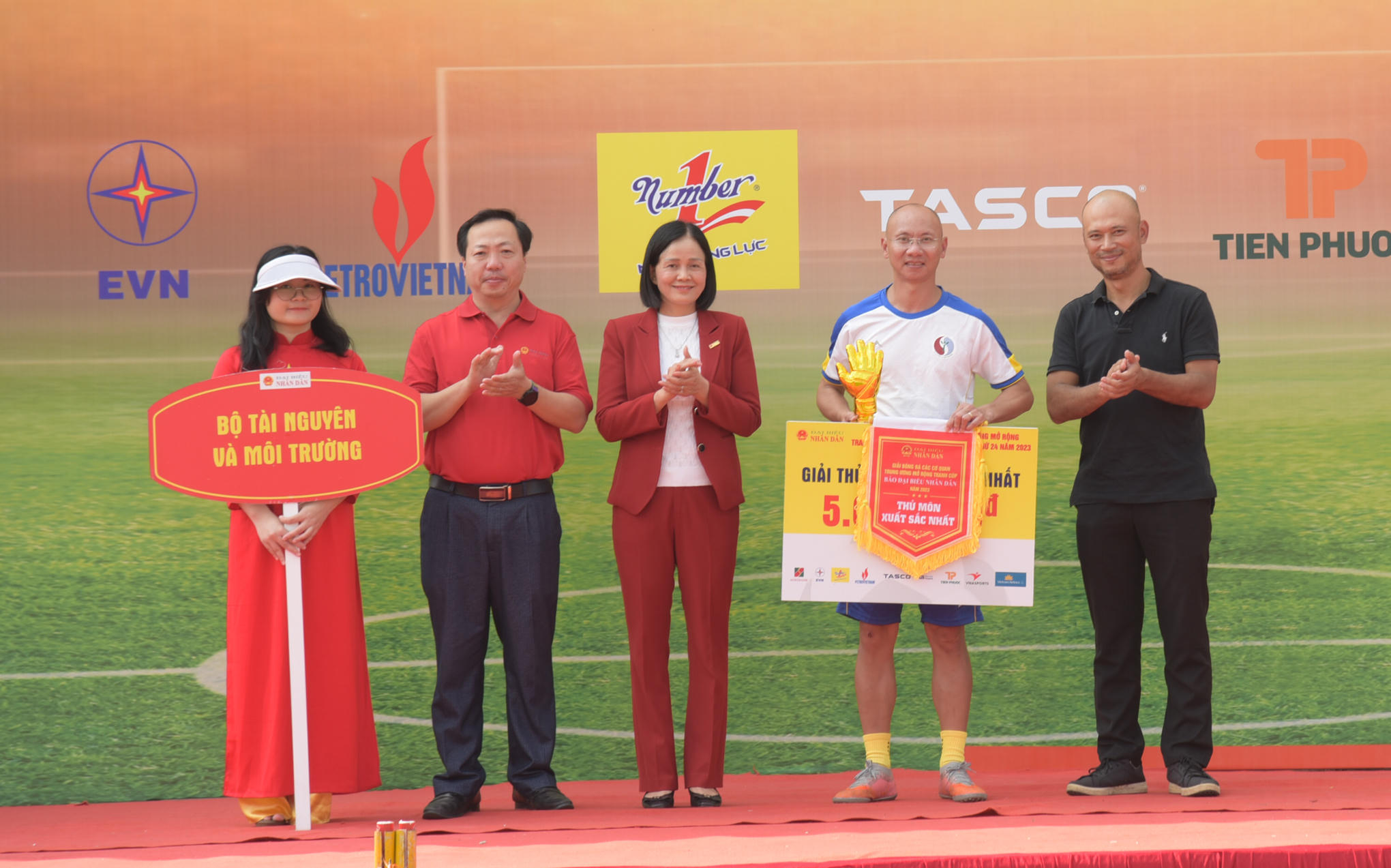 Phó Tổng Biên tập Nguyễn Thị Minh Hằng; Nhà báo Trịnh Long Vũ trao danh hiệu Thủ môn xuất sắc nhất cho cầu thủ Đặng Trọng Hải, đội bóng Bộ Tài nguyên và Môi trường. Ảnh: Quang Khánh