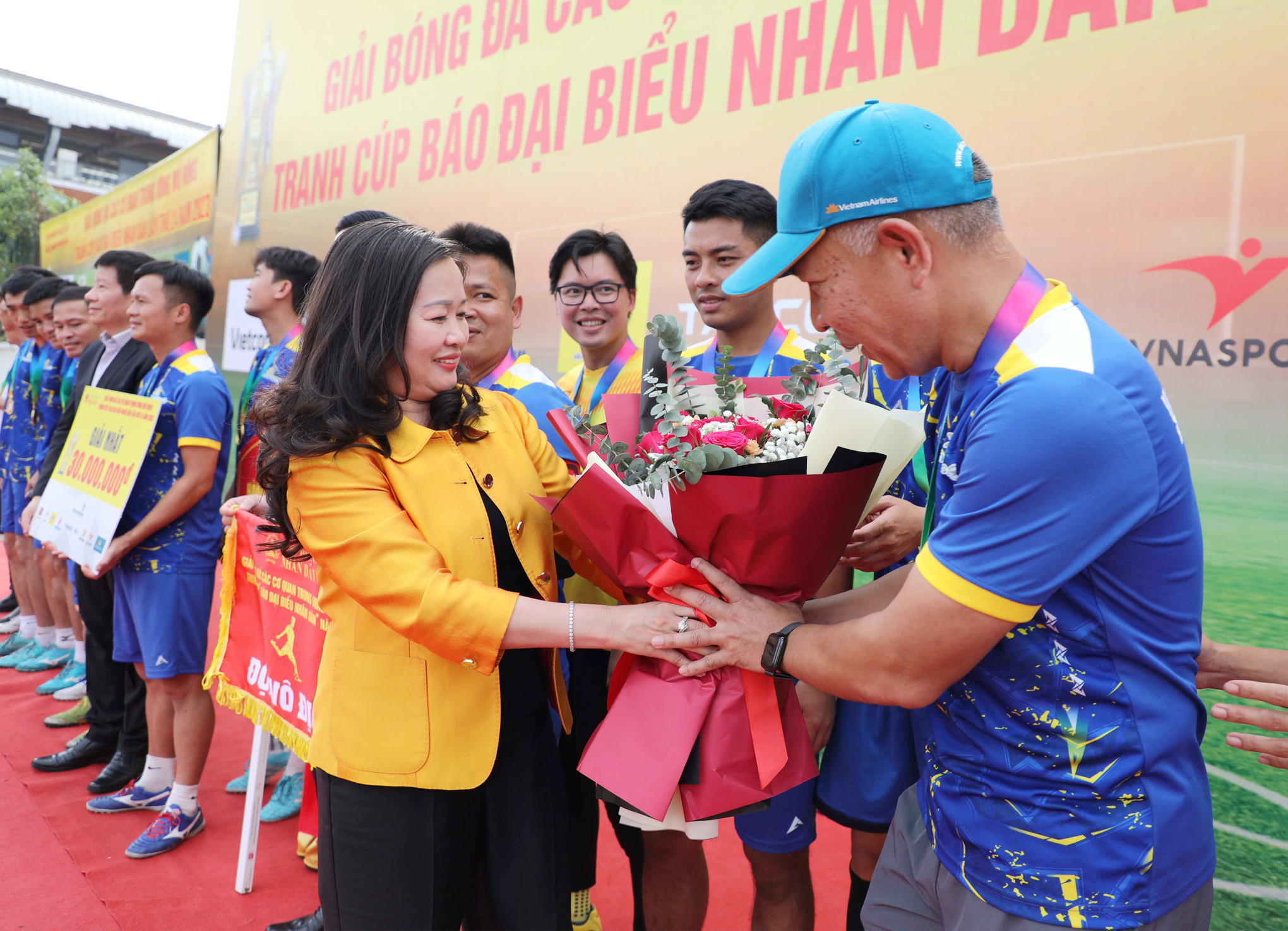 Tổng Biên tập Báo Đại biểu Nhân dân Phạm Thị Thanh Huyền - Trưởng Ban Tổ chức Giải tặng hoa chúc mừng đội bóng Vietnam Airlines. Ảnh: Khánh Duy