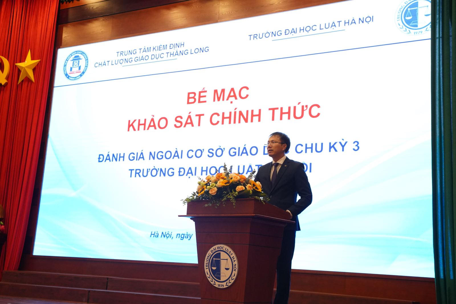 Phát biểu tại buổi lễ, TS. Phí Thị Nguyệt Thanh - Phó Giám đốc Trung tâm KĐCLGD Thăng Long gửi lời cảm ơn tới tập thể lãnh đạo Nhà trường và toàn thể các thầy, cô giáo, đại diện sinh viên và học viên đã tạo điều kiện cho Đoàn khảo sát chính thức triển khai các hoạt động của Đoàn tại Trường. TS. Phí Thị Nguyệt Thanh hy vọng rằng những đánh giá và khuyến nghị của Đoàn giúp tư vấn cho Nhà trường có cái nhìn đầy đủ, toàn diện về các hoạt động đào tạo từ đó góp phần vào hoàn thiện chính sách chất lượng của Nhà trường và đưa ra những giải pháp cải tiến việc nâng cao chất lượng đào tạo trong các chu kỳ tiếp theo, đồng thời đây cũng là cơ sở để thực hiện các bước tiếp theo thẩm định kết quả đánh giá và công nhận đạt tiêu chuẩn chất lượng giáo dục đối với Trường Đại học Luật Hà Nội.