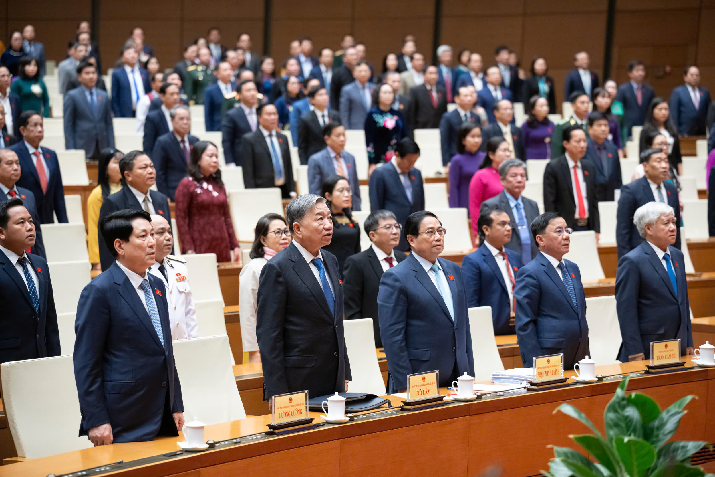 Các lãnh đạo Đảng, Nhà nước và các đại biểu thực hiện nghi thức chào cờ tại phiên bế mạc. (Ảnh: Cổng TTĐTQH) |