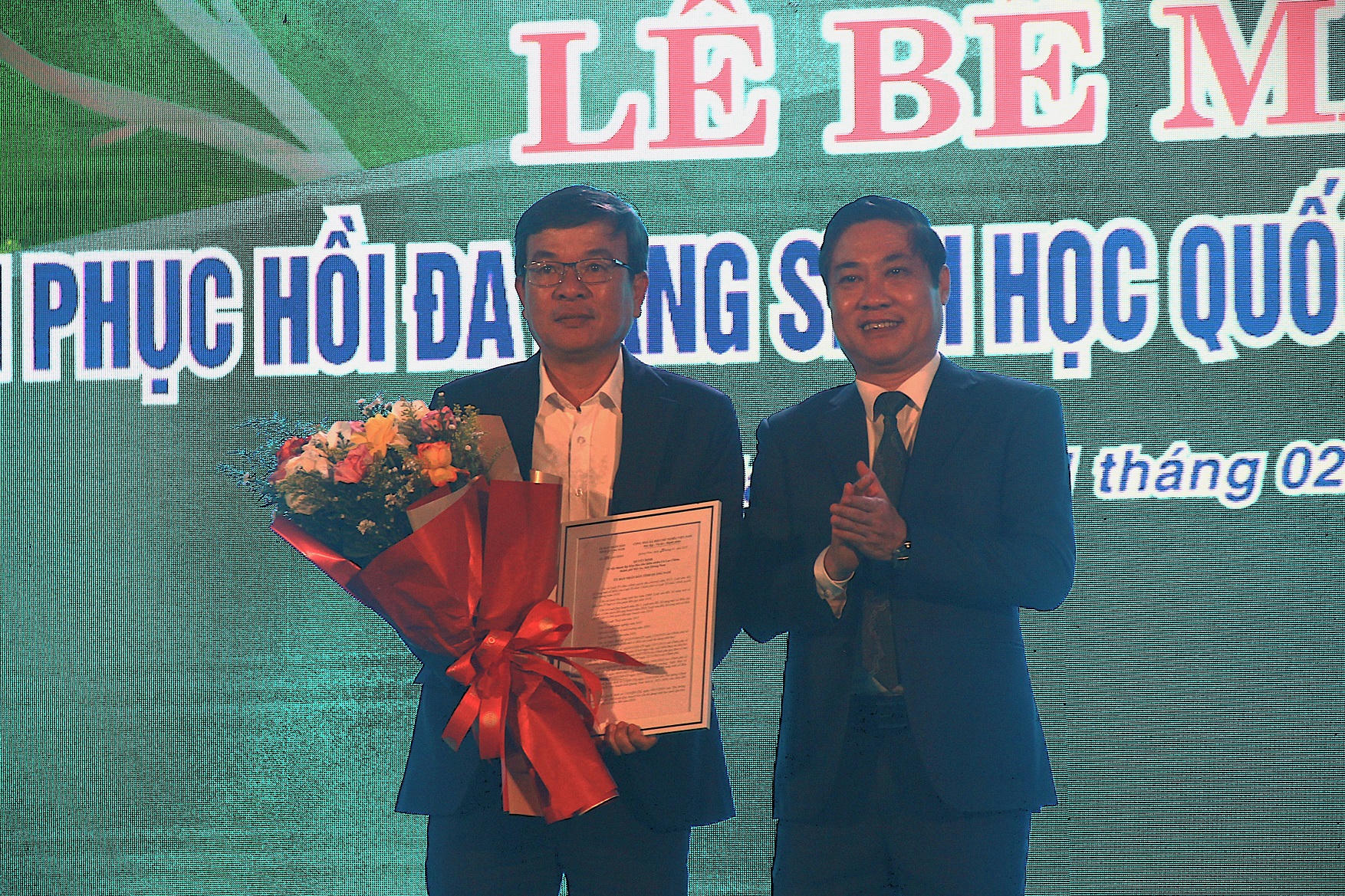 Chủ tịch UBND tỉnh Quảng Nam Lê Văn Dũng trao chứng nhận và hoa cho các tập thể có nhiều đóng góp tích cực trong Năm phục hồi đa dạng sinh học quốc gia. (Ảnh: Công Huy). |