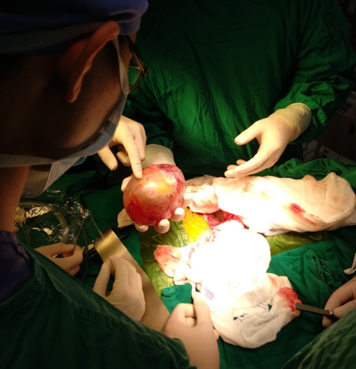 Bác sĩ phẫu thuật mang khối u thai ra ngoài.Ảnh bệnh viện cung cấp |