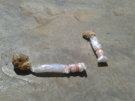 Hai chiếc bả đầu độc chó anh Nhuận có chiều dài khoảng 10cm, được tạo bằng cách quấn bên ngoài bằng vỏ ni lông sáng. Một đầu ni lông được vo tròn, dùng dây thun cột chặt. Quá trình tiếp xúc, chúng tôi cảm nhận được một mùi hôi rất nồng, xộc thẳng vào mũi gây cảm giác đau đầu, chóng mặt. Sau khi ngửi thấy mùi, chúng tôi phải đi rửa mặt bằng nước mát thì 10 phút sau mới bình thường trở lại.